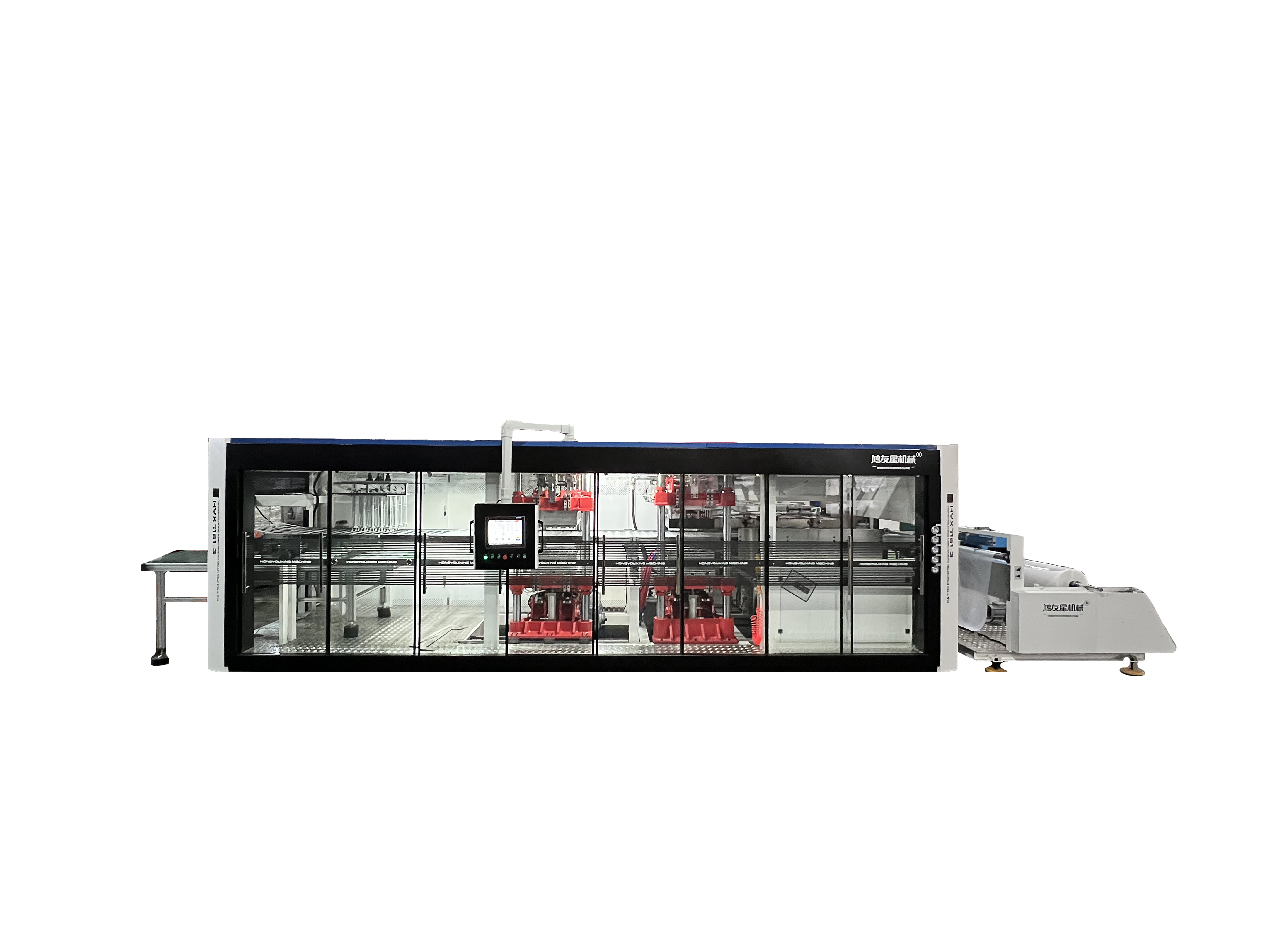 我們的主要產品有 HYX-850全自動正負壓3/4工位熱成型機(成型-裁切-沖孔-堆疊)、 HYX-1220 PLC全電腦控制自動真空熱成型機、 HW-7072負壓成型裁切一體機(成型-裁切-堆疊)、 HW-730自動氣壓成型杯蓋碗機、 厚片吸塑機、 30-150T液壓裁斷機、 冷水機和空壓機等輔機、 熱成型模具。